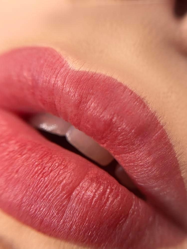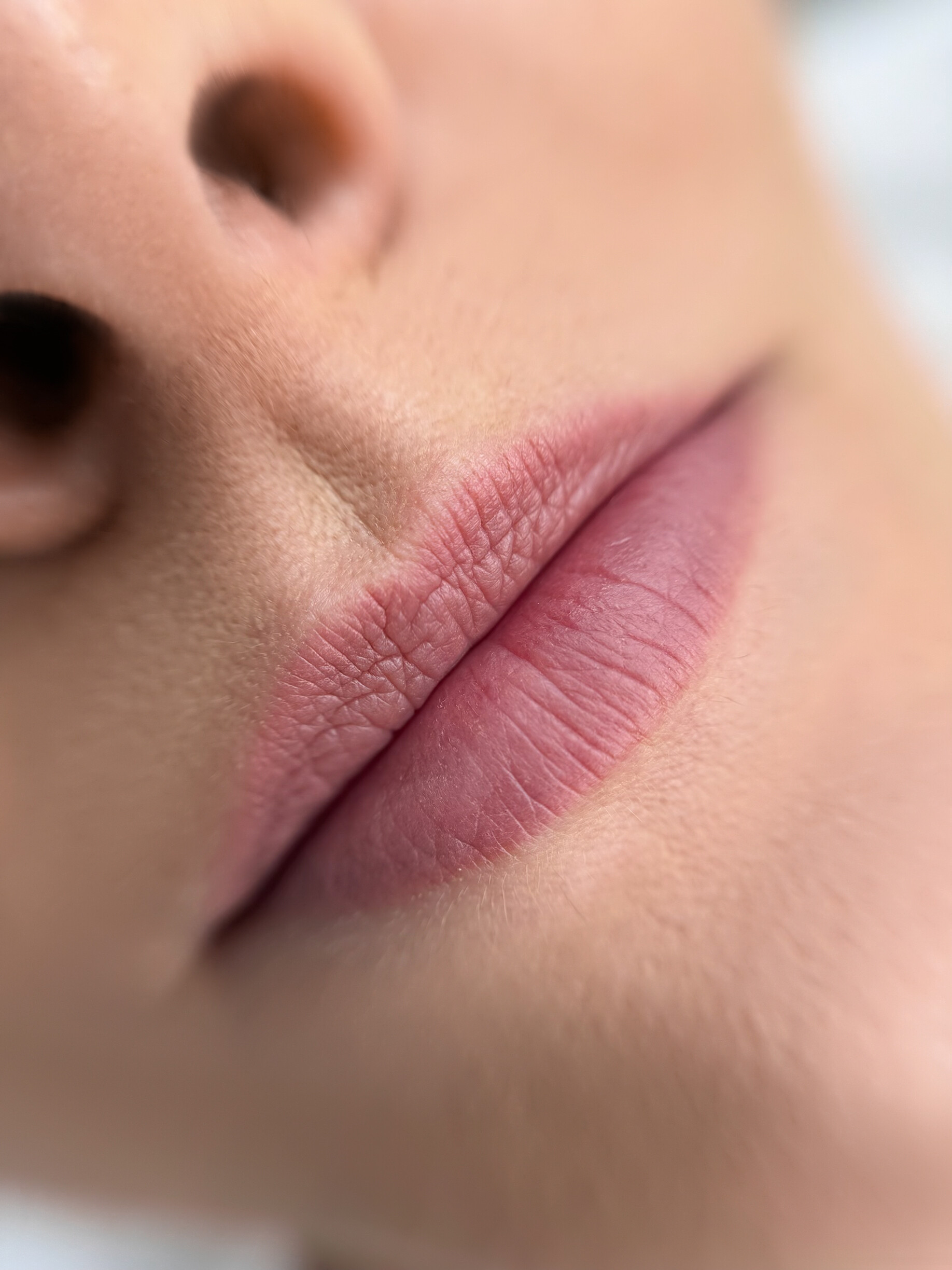 Subtelny, póltransparentny efekt zabarwionych ust w odcieniach nude.